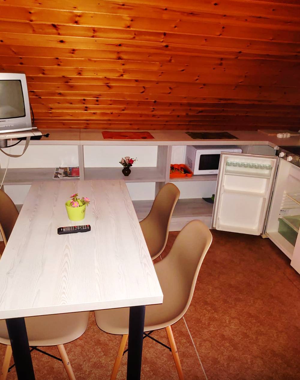 s vlastním vchodem (z levé strany) disponuje terasou s posezením. K dispozici je ložnice s dvěma lůžky, obývák s dalšími dvěma lůžky a kuchyňkou a vlastní koupelna s WC.